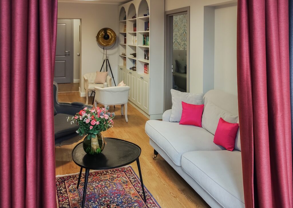 Metamorfoza – Transformarea spectaculoasa a unui apartament de bloc din anul 1986. Acest proiect de amenajare a fost o adevarata provocare, a necesitat o abordare aparte, a solicitat toata creativitatea, imaginatia si ingeniozitatea echipei Eclectarte. S-a dorit un interior cald, cu atmosfera serena in nuante pastelate, un camin cu intimitate si personalitate. Am dorit sa cream un spatiu clasic – contemporan cu piese de mobilier cu linii elegante, clasice dar cu partea de lemn patinata conferindu-le astfel un aspect rafinat, estetic. Rosul vibrant rubiniu l-am introdus ca accent cromatic in dialog cu nuantele pastelate, ivoir, griuri pe care si le-au dorit beneficiarii.